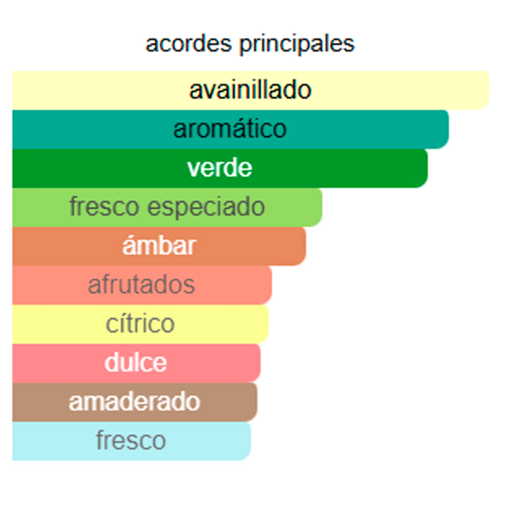 Descripción aromática: Las Notas de Salida son menta, limón y manzana verde; las Notas de Corazón son geranio, flor de azahar y ambar; las Notas de Fondo son vainilla, sándalo y cedro.